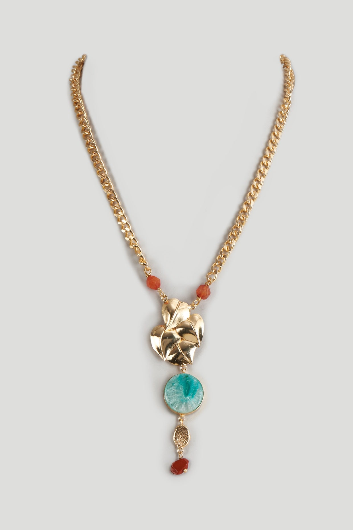 18kt gold plated necklace with multi heart, leaf, circular stone drops.