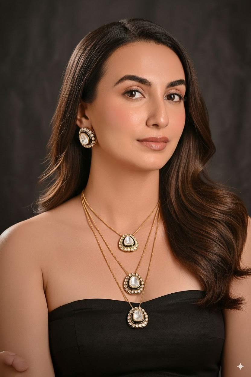Elegant layered necklace set featuring kundan pendants and matching earrings. A timeless jewelry piece, perfect for weddings, festive occasions, and party wear.