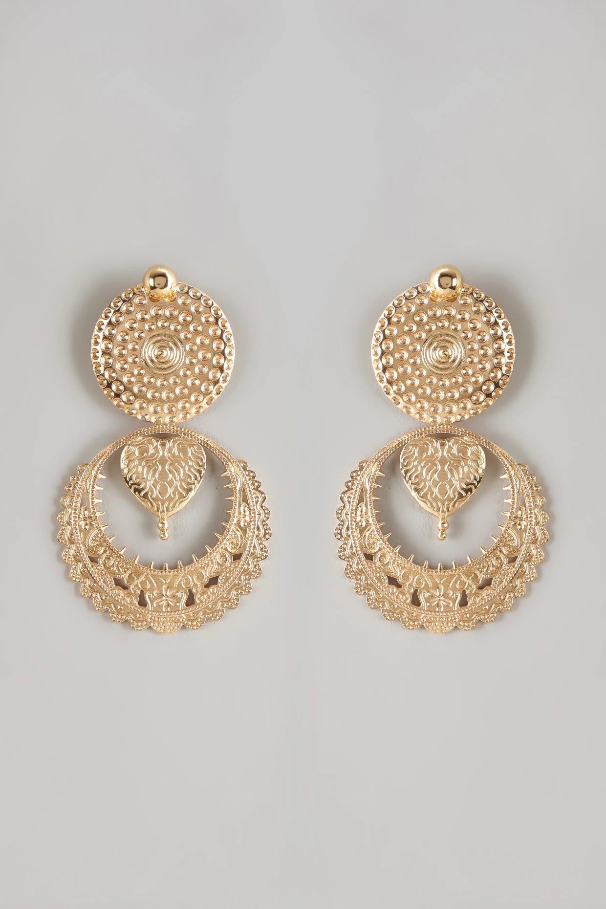 18kt gold plated dangler earrings with circular motifs featuring Mughal art carvings.